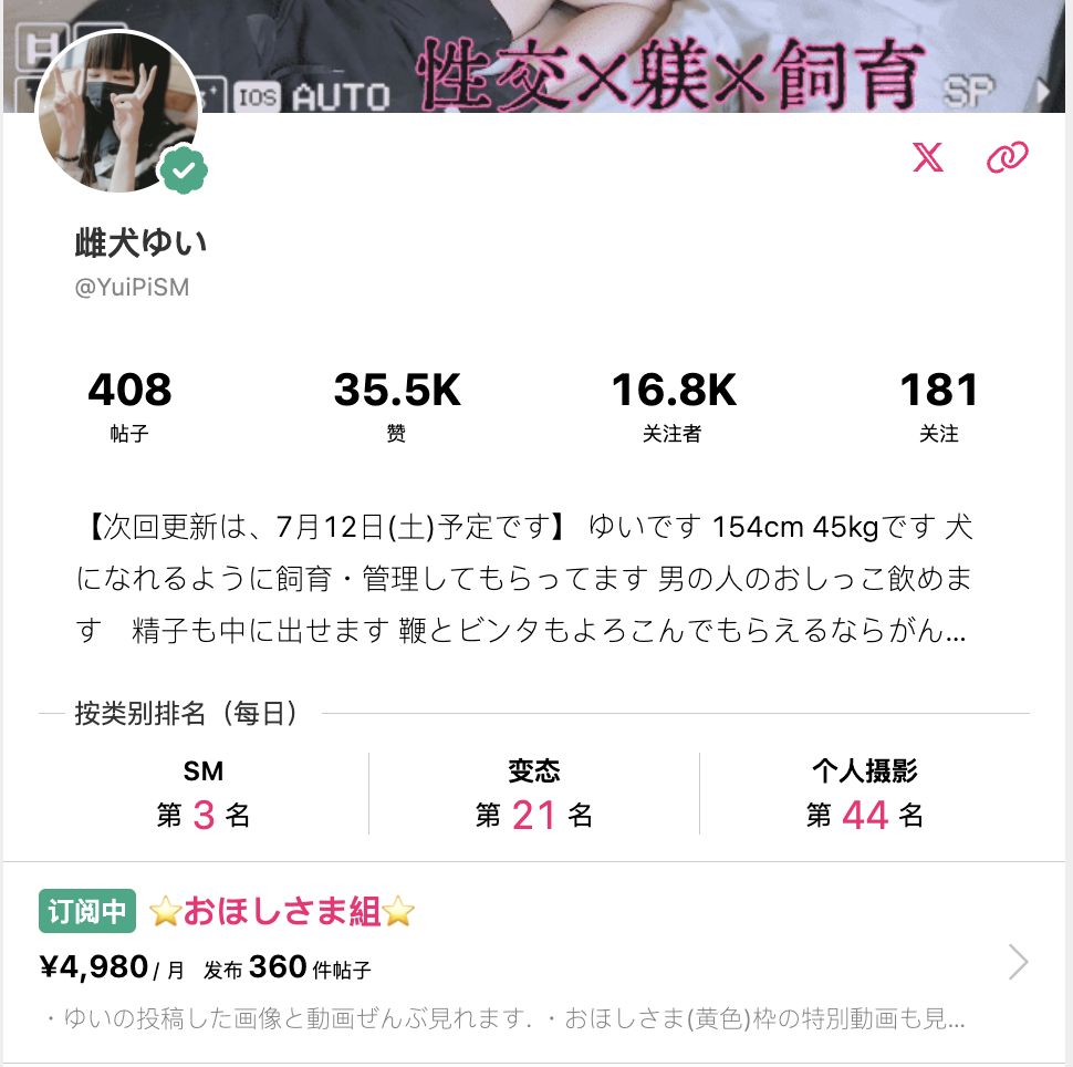 myfans萝莉博主雌犬ゆい@YuiPiSM原版付费订阅合集,订阅视频截止到2025.7.5号,价值日元5478,折合RMB270元,顺便吐槽下现在myfans订阅的手续费越来越高了,博主介绍:极品萝莉,身高154厘米,体重45千克,我正在接受调教和饲养,以成为一只○○○狗 可以喝男人的尿,也可以接受精液射在体内,我会努力通过被鞭打和被打脸来让你高兴,为男人服务和奉献是YUI的幸福,请把我当作发泄压力和性欲的工具;